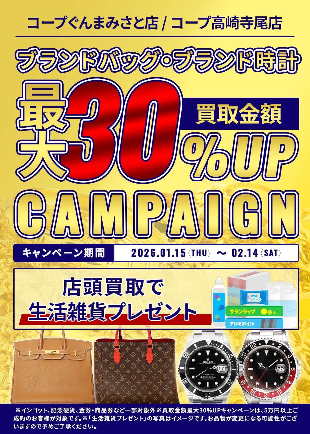 ◆【第二弾】ブランドバッグ・時計 MAX30%UPキャンペーン+生活雑貨プレゼント